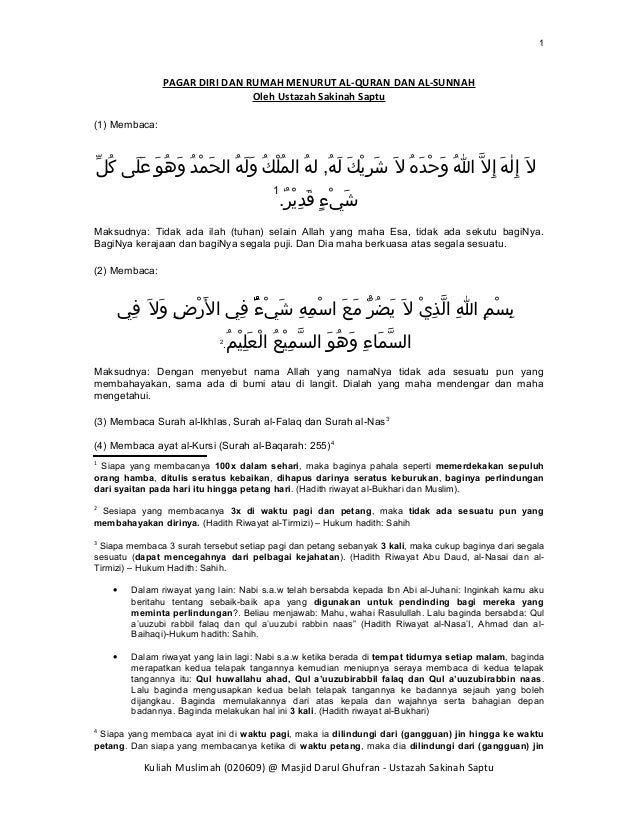 Pagar Diri Dan Rumah Menurut Al Quran Dan Al Sunnah. 3 Membaca Surah al-Ikhlas Surah al-Falaq dan Surah al-Nas 3 4 Membaca ayat al-Kursi Surah al-Baqarah.